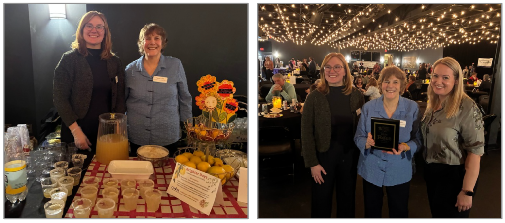 Description: Two images side by side. On the image on the left, Sherry Lewis and Payton Corl are smiling at their Mocktail Magic table with their sample cups filled with a yellow-lemon mixture on the table. Lemon and sunflower themed decor are also on the table.  On the image on the right, Sherry and Payton are pictured smiling and receiving the award for the best mocktail of the night with Cortland Prevention Resources Director, Melissa Simmons.